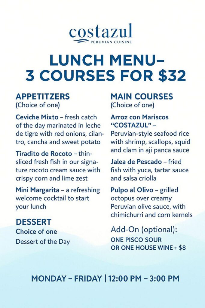 Discover our Lunch Special at Costazul—the perfect way to enjoy the authentic flavors of Peru in the heart of Coral Gables. Indulge in a 2-course prix fixe menu featuring your choice of traditional dishes, crafted with the freshest ingredients and bold Peruvian spices. To complete your meal, enjoy a refreshing glass of Chicha Morada, Peru’s iconic purple corn drink. Join us for a delicious and satisfying lunch experience that brings the taste of Peru to your day! 🍽️✨